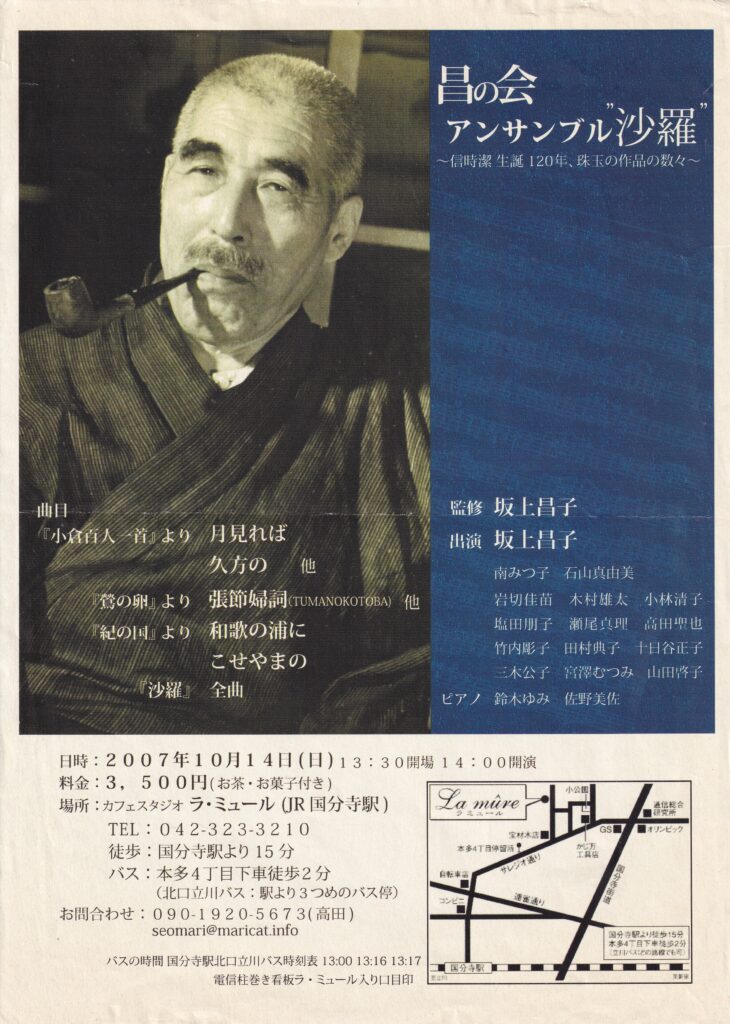 信時潔氏と親交の深かった木下保が提唱した「やまとことば」の唱法を受け継いでいるアンサンブルの会です。歌唱法の中で、いかに日本語の美しさと味わい深さを表現できるかを研究しています。言葉の意味だけでなく、詞がいつの時代を表現しているのかで、歌い方を区別しています。そのような作品は、信時潔の音楽でなければできないことだと思います。それぞれの曲の違いを感じていただければ幸いです。(国分寺市 信時潔生誕125周年記念事業 出演者プロフィールより)